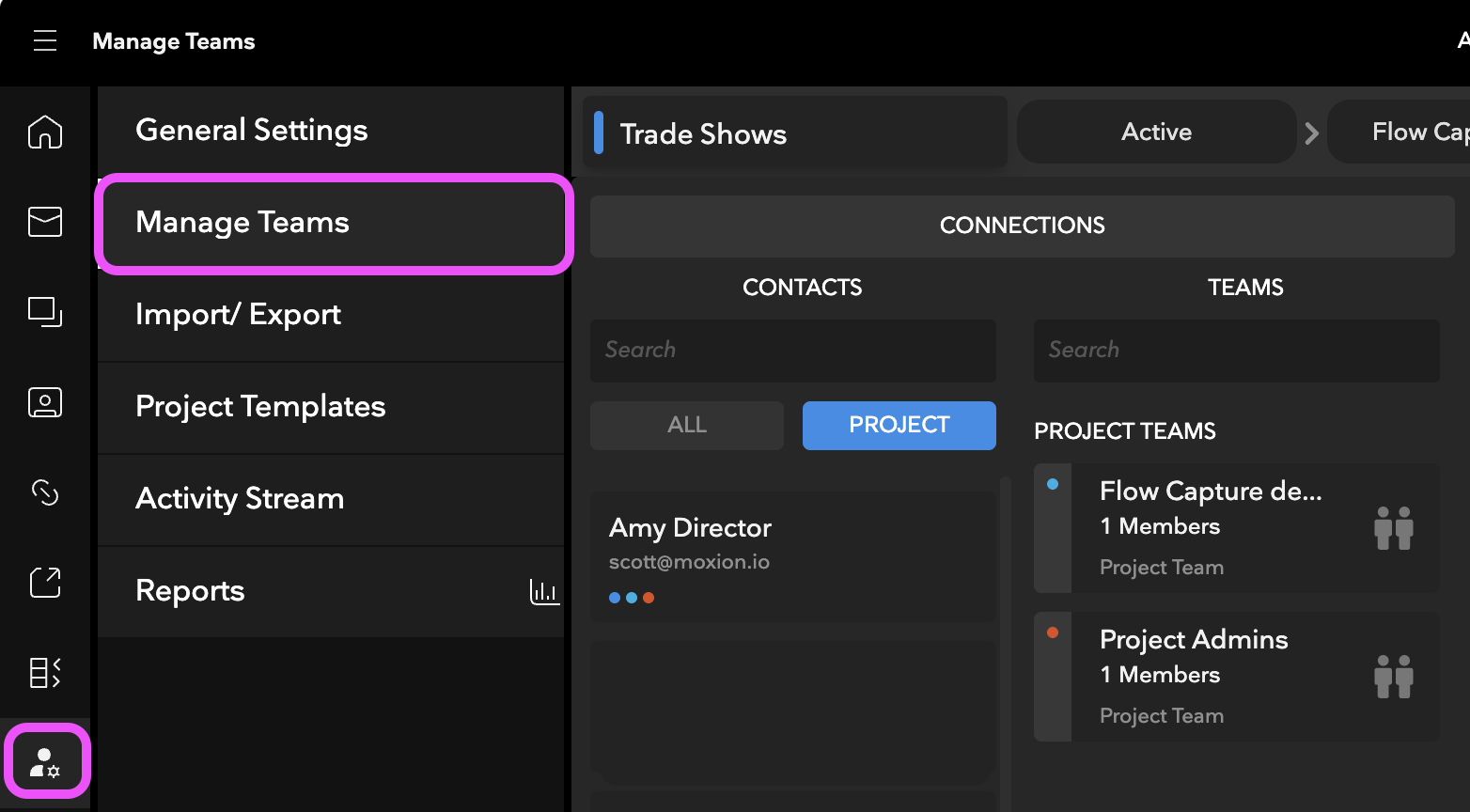- Click on the Administration tab of any Folder in Flow Capture and open the Manage Teams panel