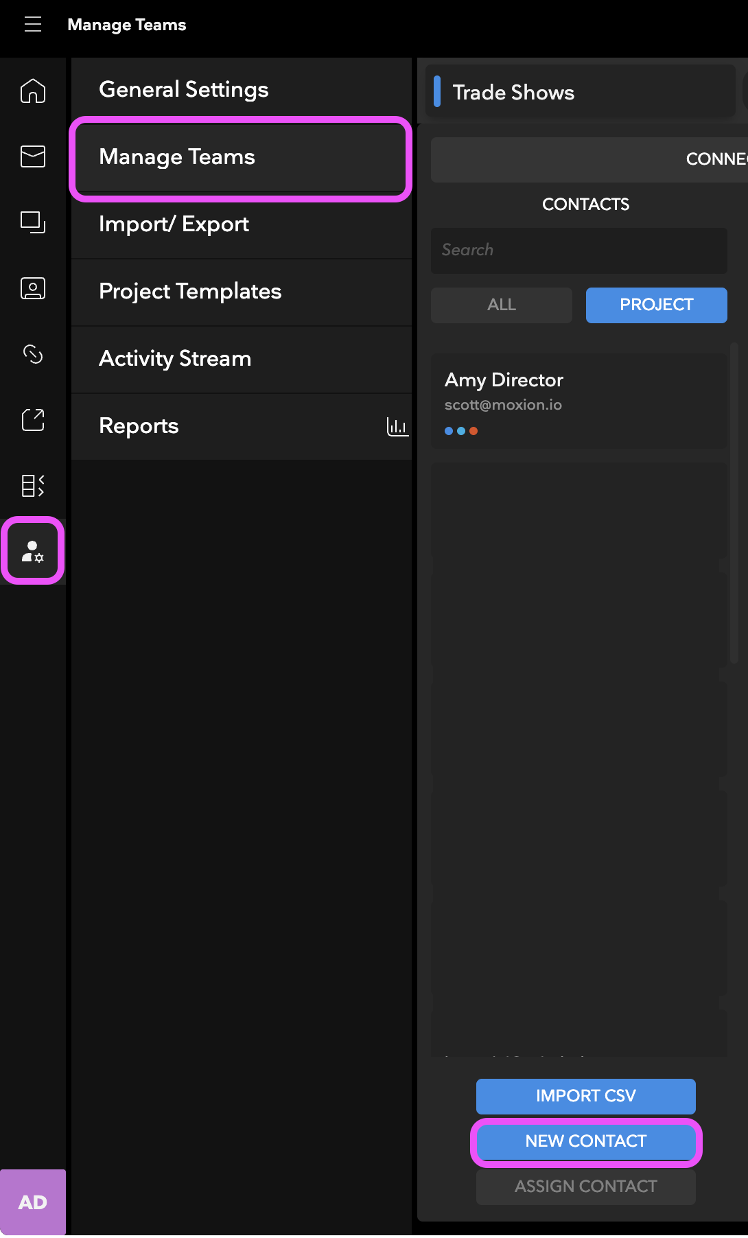 Once the Contact has been added, click on the Folder in the Project or Folder Selector column, right under Manage Teams. Then, click on the Contact's card in the Contacts column.