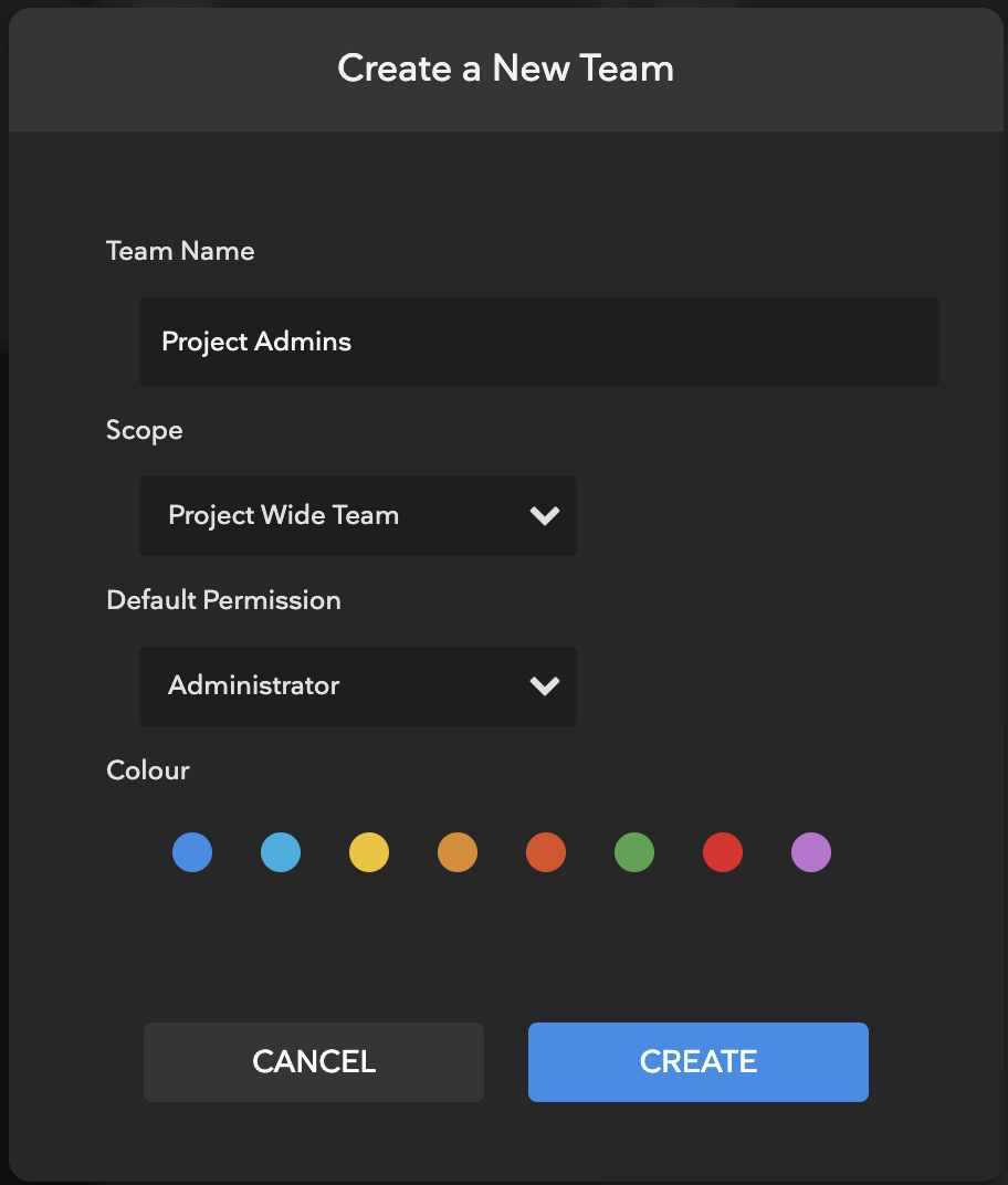 A Team is a way to organize users into easily manageable workgroups and attribute them to a particular Project or Folder. When a User has a permission set on a Team, it locks their permission level in place any time that Team is added to a Folder.