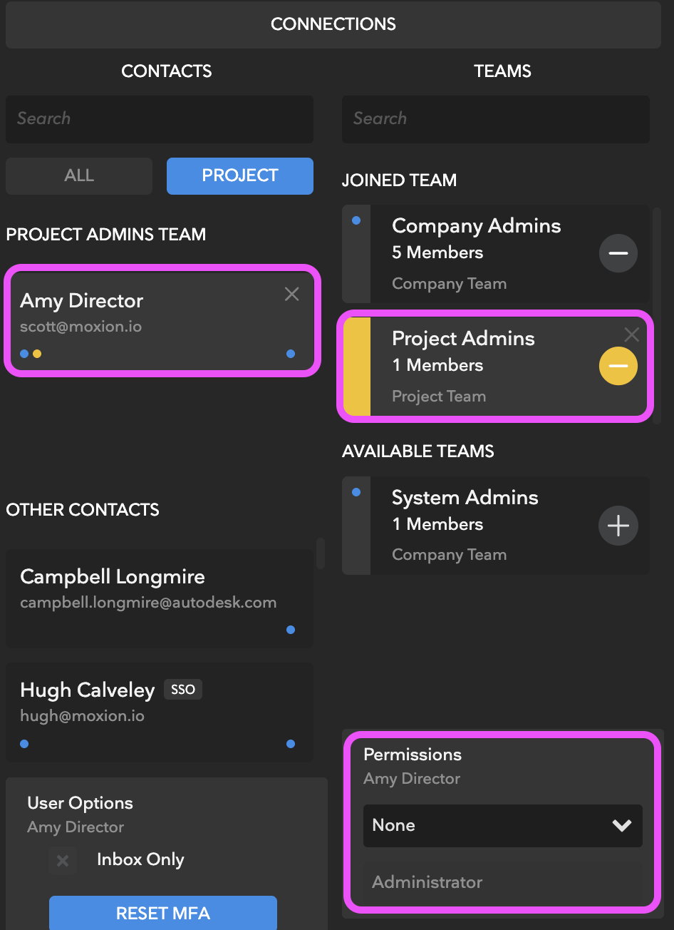 - In the Contact's column, click on the User Card for the Team member whose permission you need to change. You will see their Team options revealed at the bottom of the Teams Column.