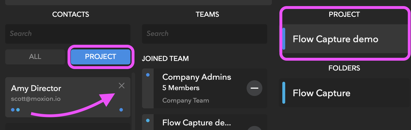 To remove a user from a Project entirely, first ensure that the Project you wish to remove them from is displayed in the middle column, to avoid removing them from the wrong one. Next, in the Contacts column, ensure that the blue "Project" tab is selected, and find that user either by searching or scrolling down. Once you've found that user, click the X in the upper right hand corner of their contact card, and they will be removed from that Project. All access to all Folders and subfolders within that Project will be revoked.