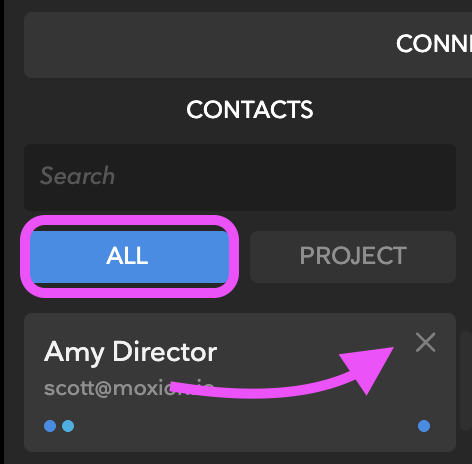 To remove a user from a Company entirely, repeat the steps for removing from a Project, but instead of selecting the blue "Project" tab, select the "All" tab to the left of it. Clicking the X in the upper right hand corner of the contact card with "All" selected will remove that user from all Project under that Company.