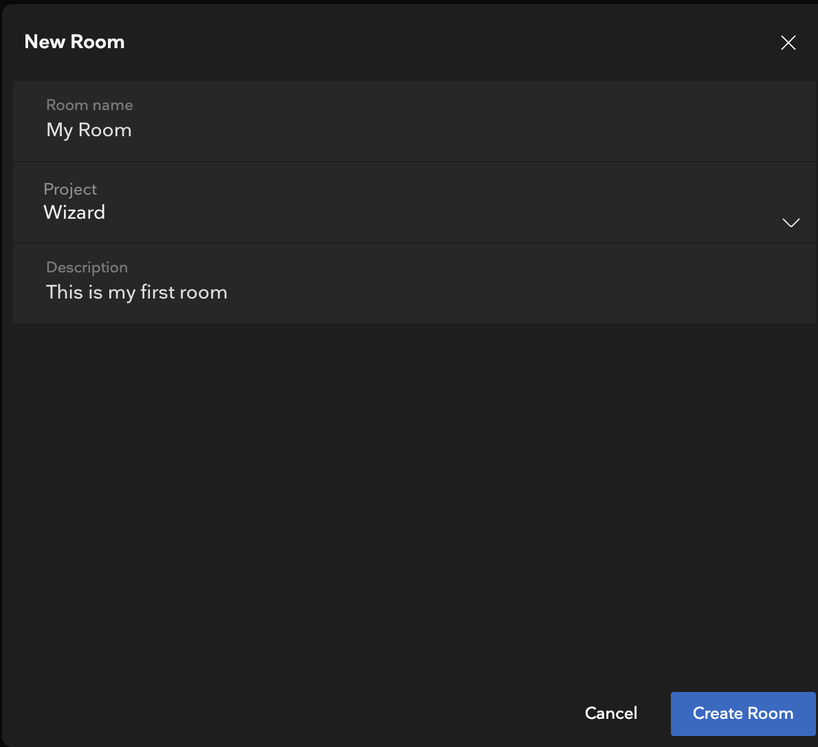 To get started, click the Create Room button beneath the Rooms tab at the top of the page. This will open up a window where you can name the Room, choose the project it will be associated with. You can also add an optional description. That and the name of the Room will be visible to all the participants you add to it.