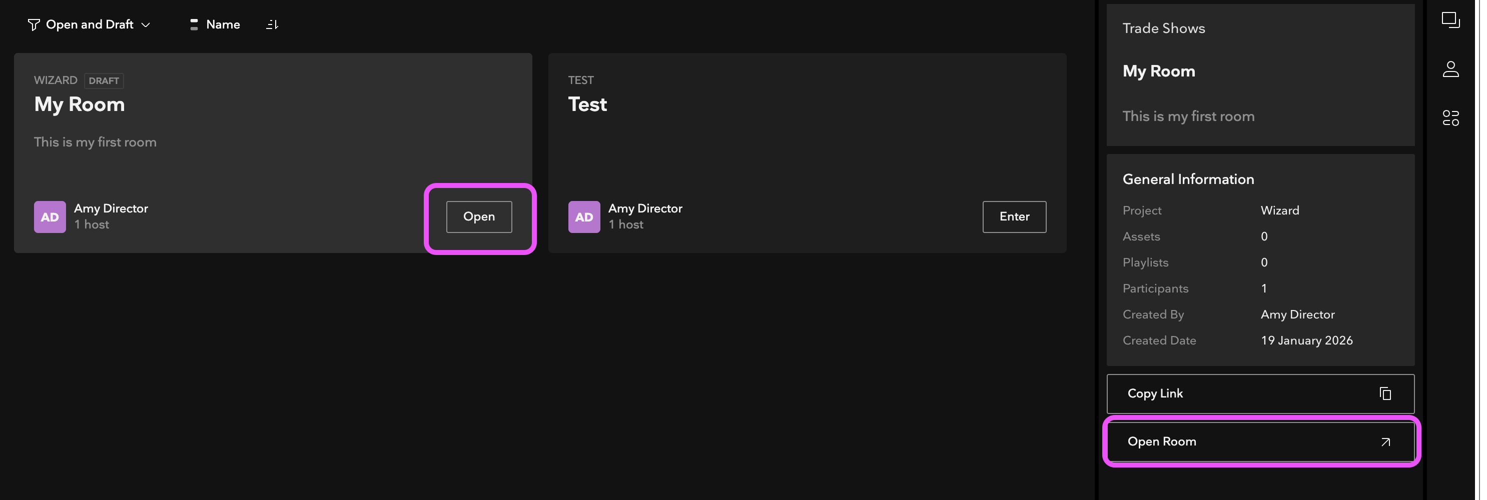 When you're ready to open the Room, click the Open button to head on in. This will also send an email notification to any participants, letting them know the Room is ready.