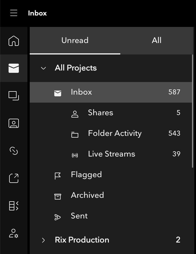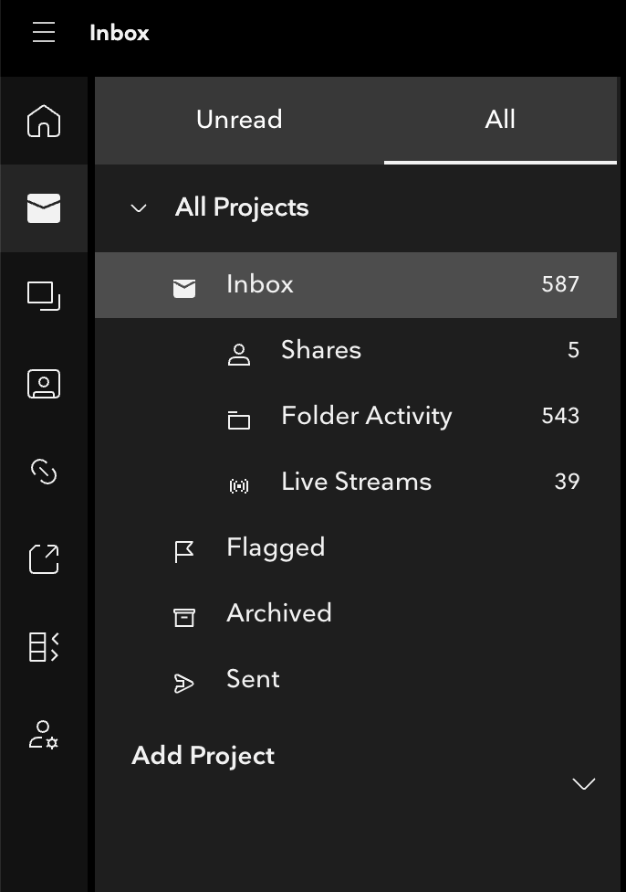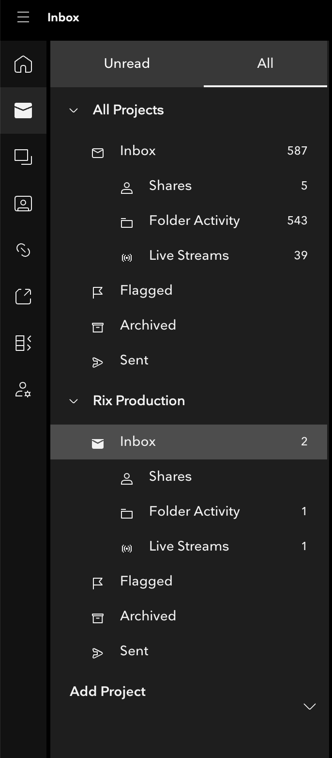 They will all have the different filters (Share, Folder Activity, etc.) that exist in your main Inbox, but here they are tied solely to the project you've got selected.