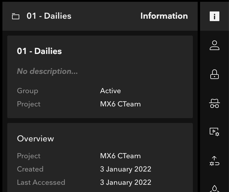Anything that's listed here can be selected and will affect what's displayed in the center viewer panel. Choosing the project, for instance, will show you all the top-level folders in it, and the information panel will give you details about the project. You can also hide the Folder Browser by clicking the Folder icon at the top, giving you more screen space to work with.