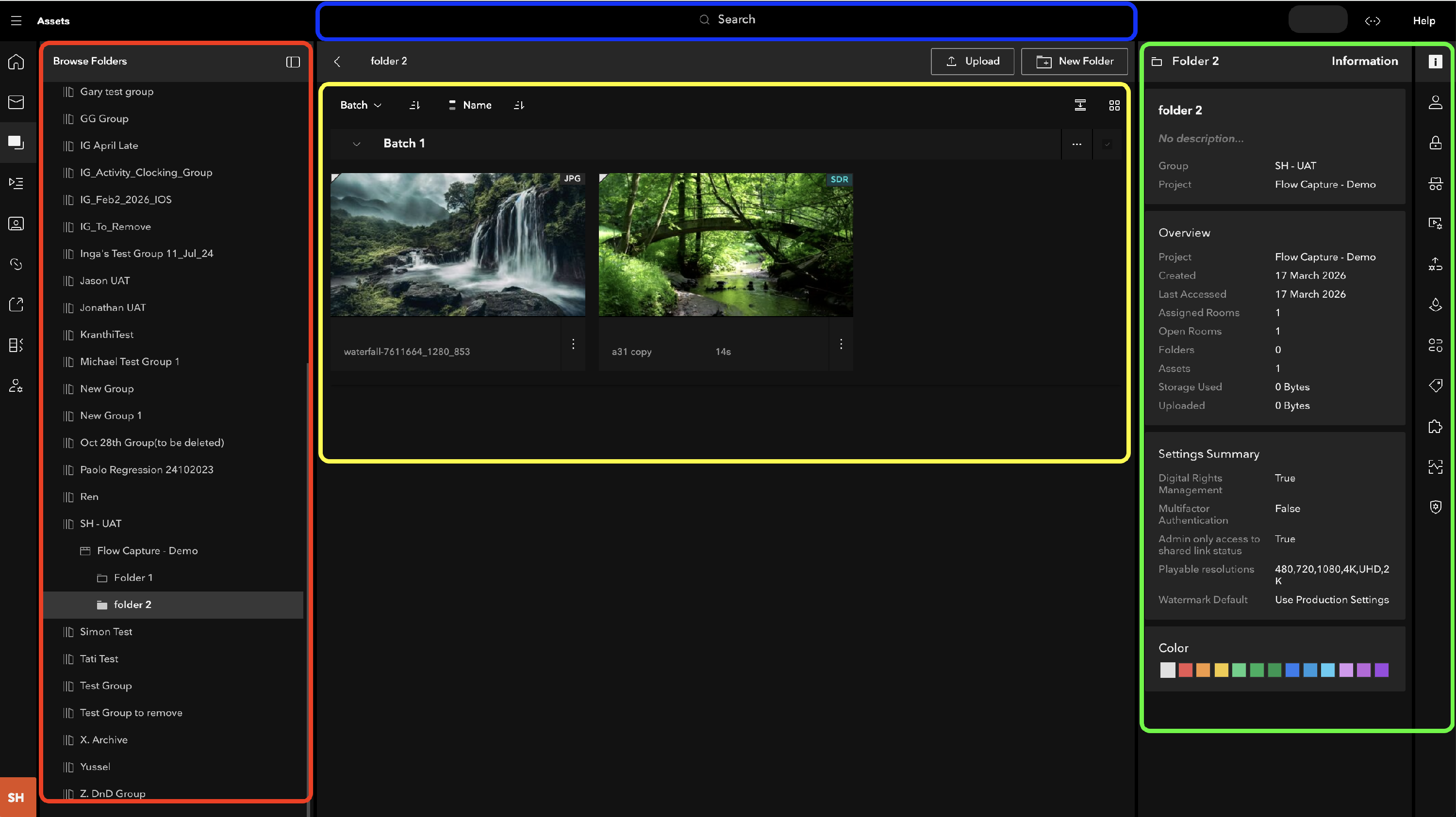 The Asset Viewer takes center stage, occupying the entire center panel. If we select a folder on the left, Thumbnails for all the assets uploaded to this folder will be displayed, as well as any sub folders found within it.