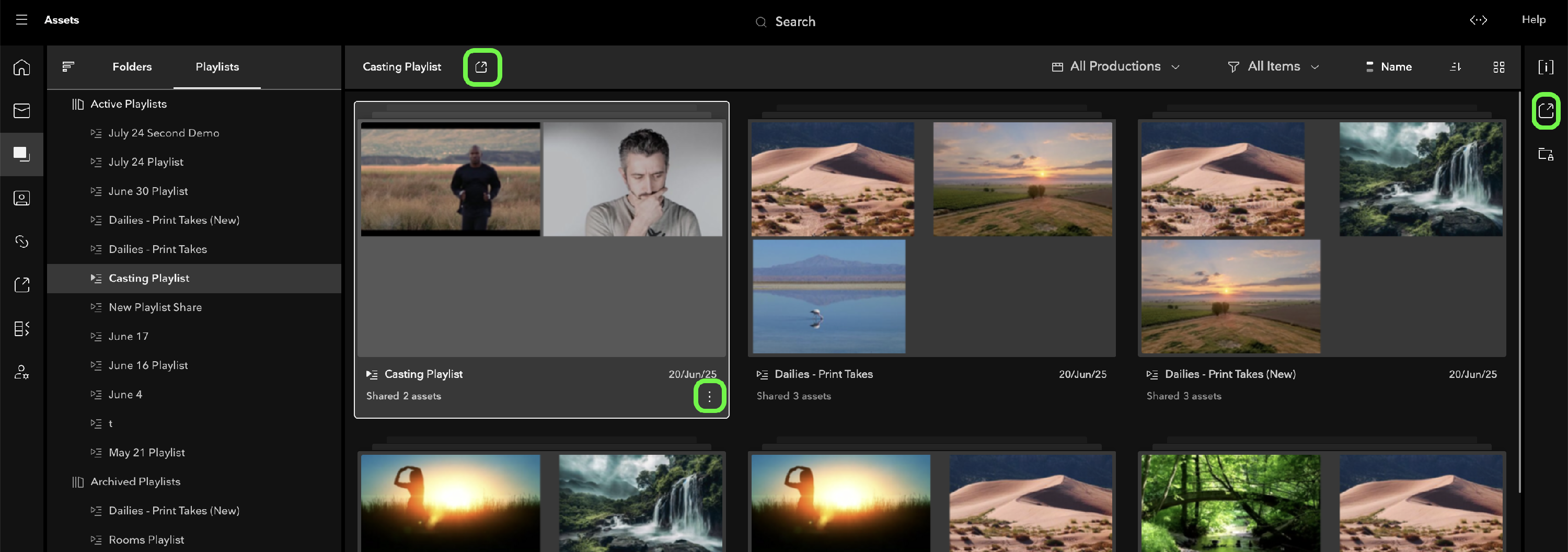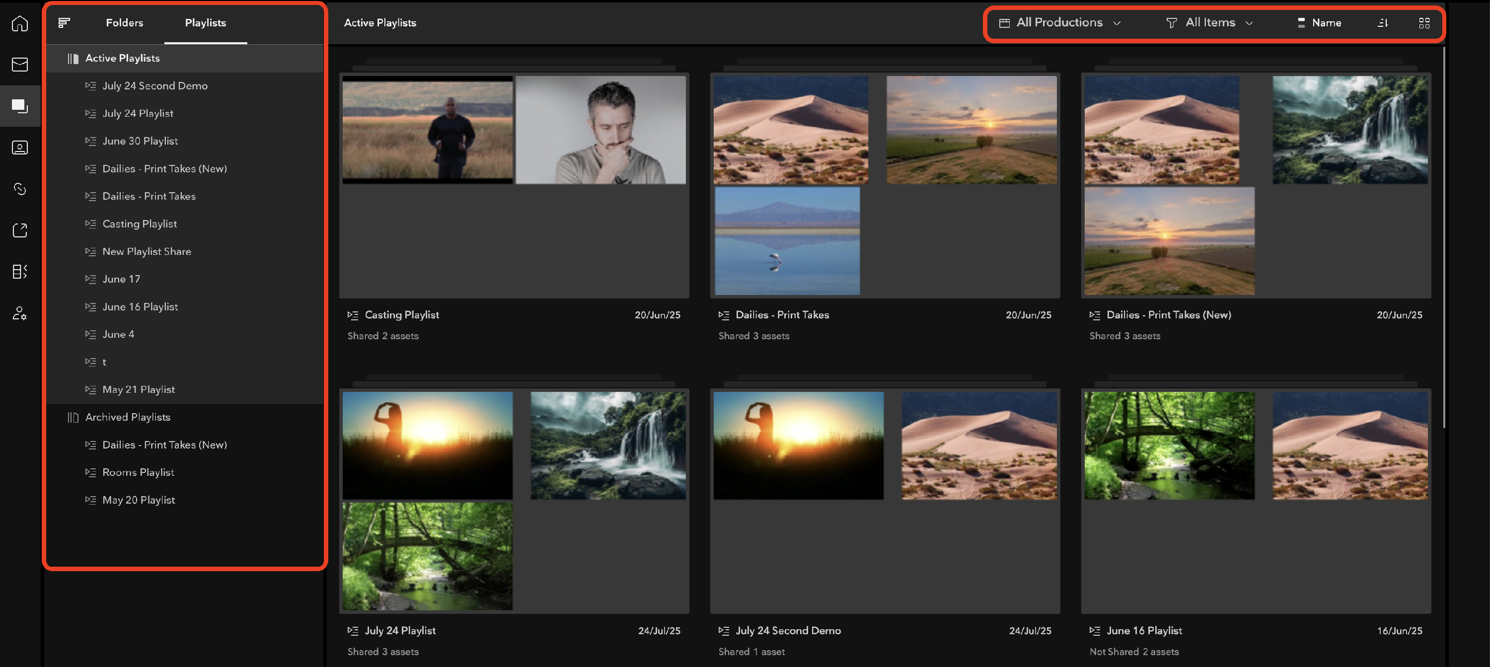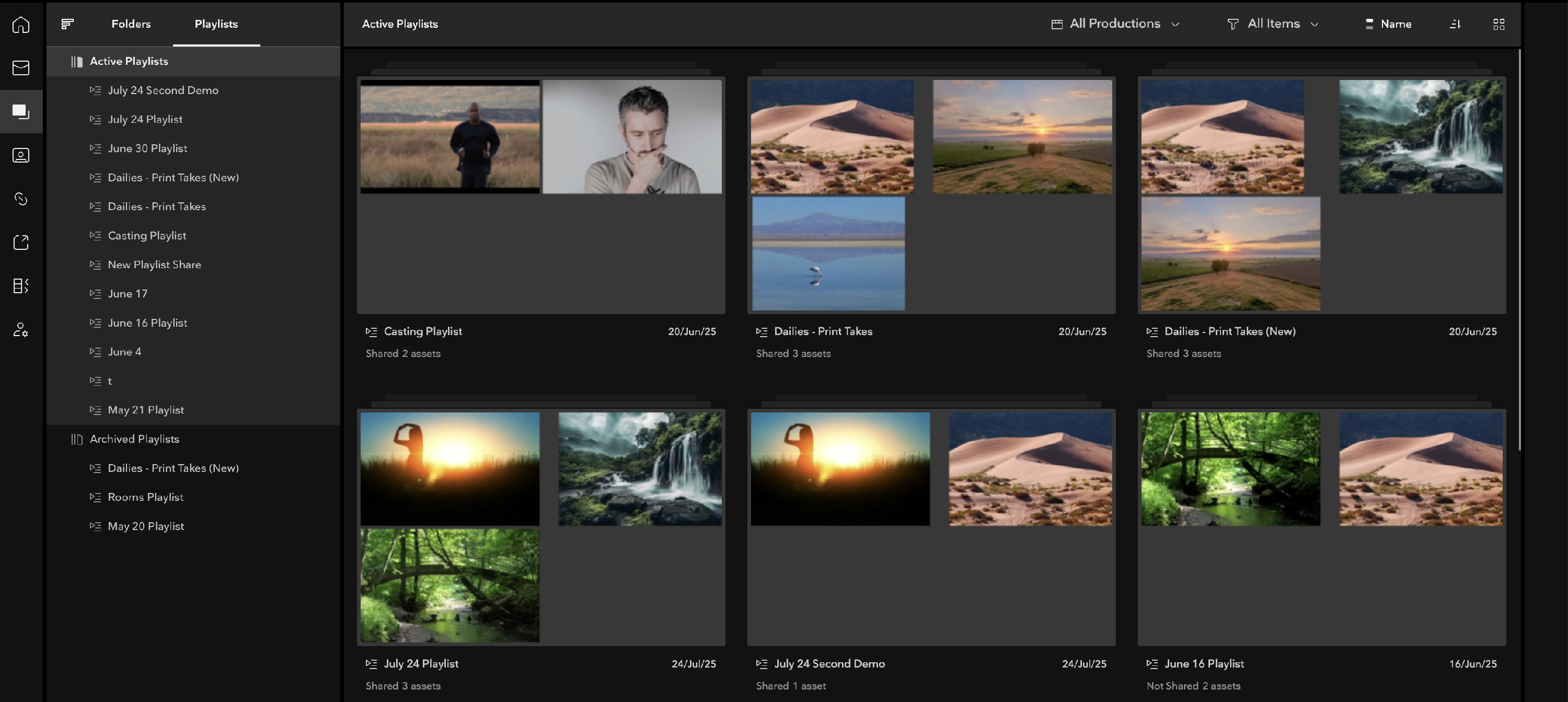 To preview the Playlists that you've created, just click on the Playlists tab within the Assets section. From here, you'll be able to see all of your Active and Archived Playlists. You can also filter your Playlists by Production, as well as which Playlists have been shared with others and which ones haven't.