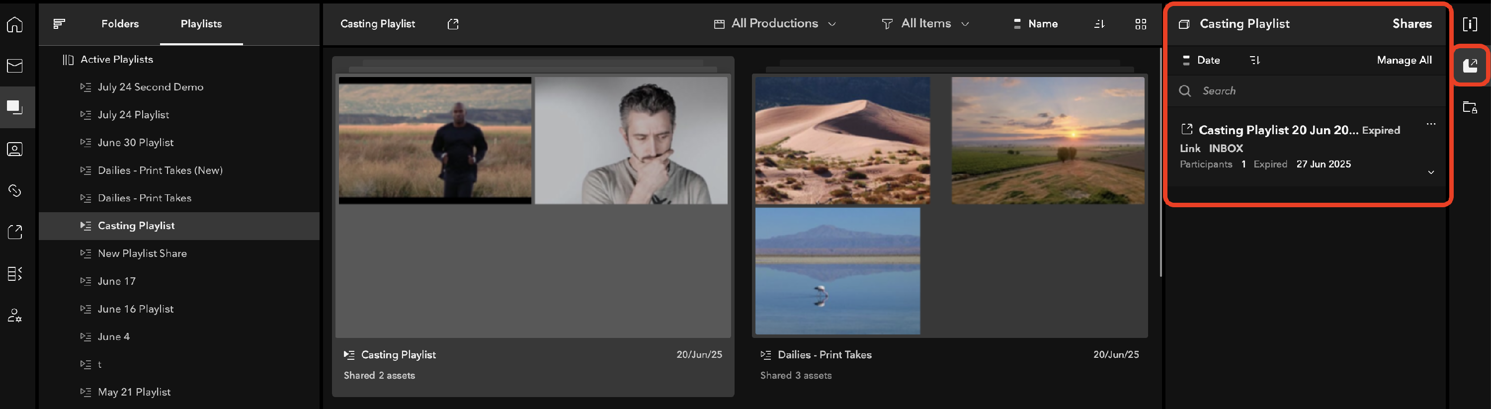 Whenever we create a new Share from a Playlist it'll appear in the Shares panel in the the righthand contextual menu.