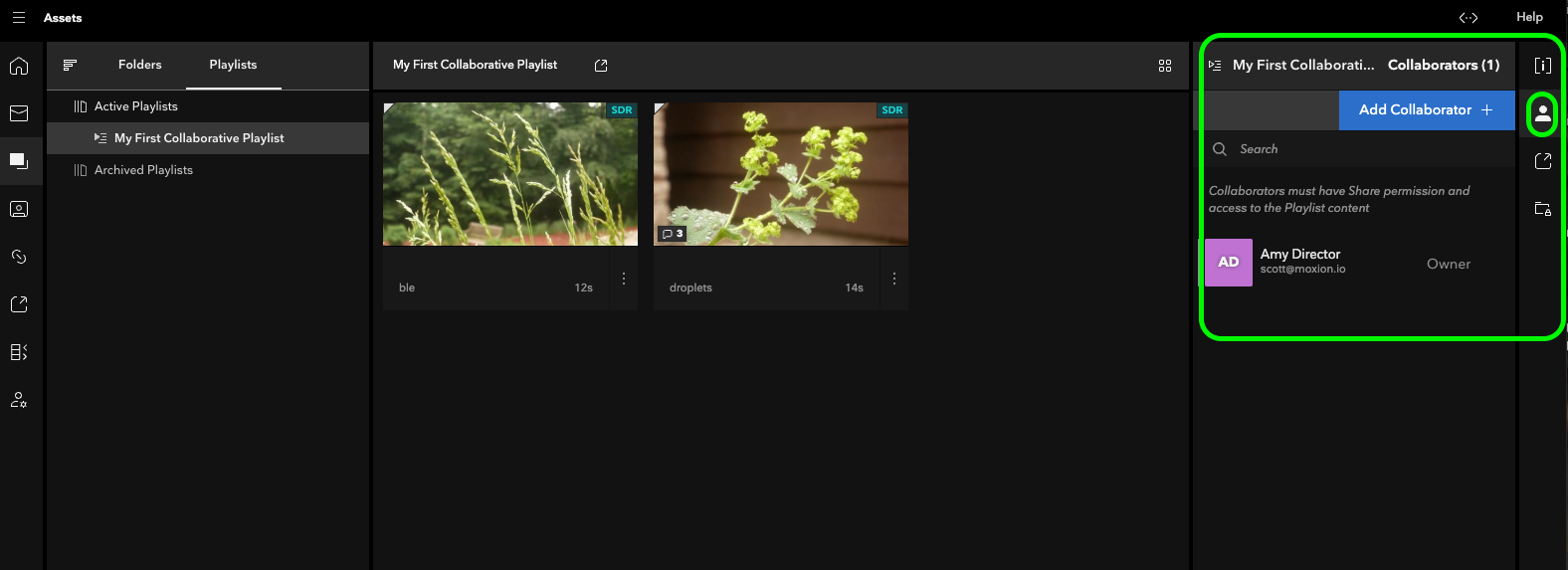 Once you’ve added them as a collaborator, they’ll appear underneath your own name as the Owner on the right hand side. They’ll also see the Playlist you’ve added them to in their Playlists section on the Assets Tab.