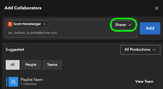 Select the user you’d like to add, then click the dropdown next to their name at the top to assign them a collaborator permission on this Playlist.