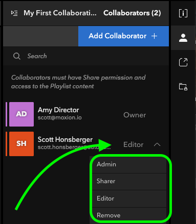 - An Editor can add, remove, and organize assets within the playlist, but can’t share the Playlist with others, nor can they add or change collaborators