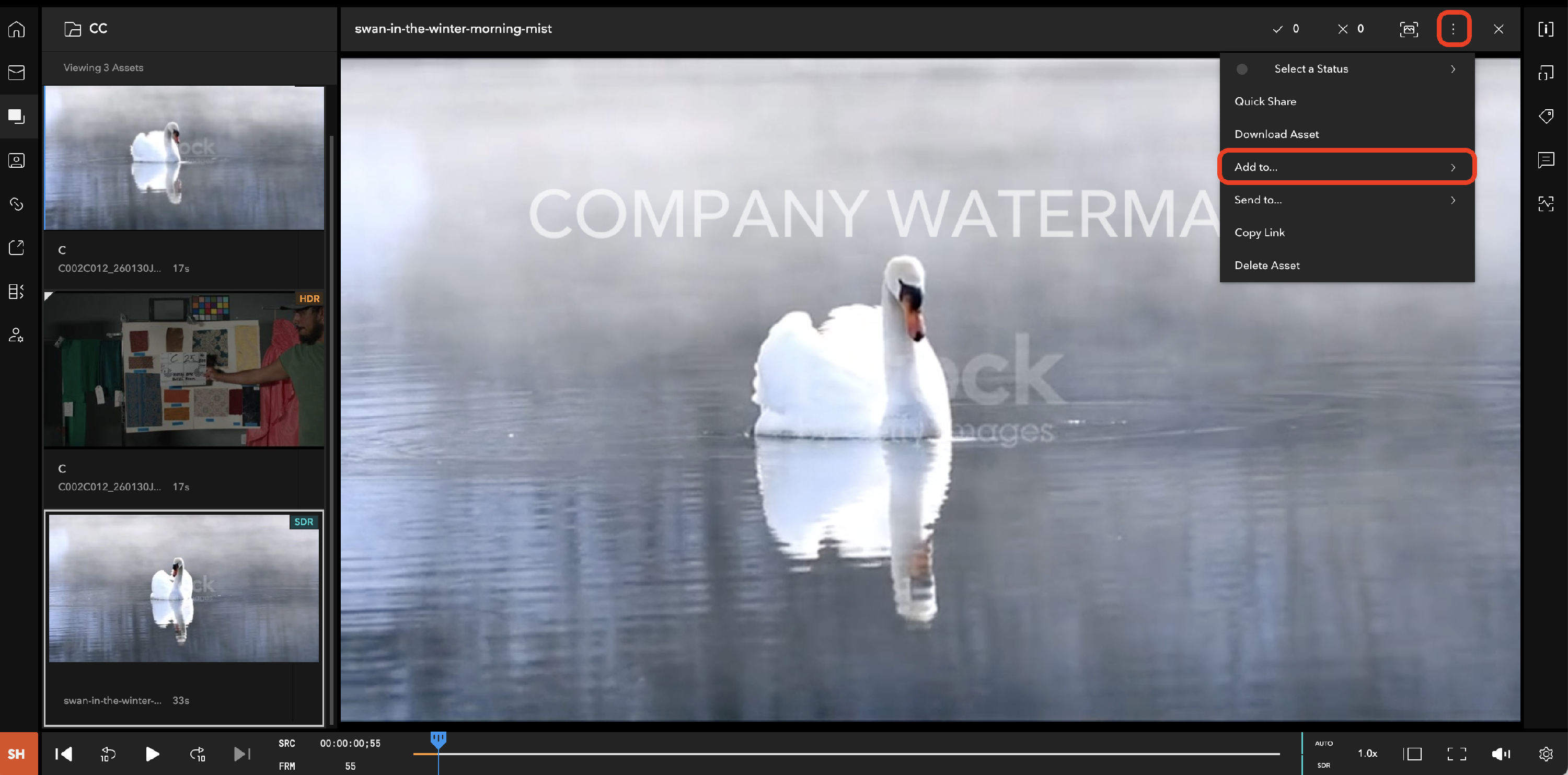 You can also add an asset to a Playlist when in the Viewer by clicking the Action Menu icon in the upper right hand corner: