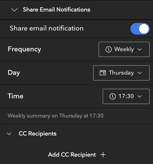- Weekly - with this option, you can select a specific day of the week and time of day, and you'll receive one email notification weekly with a summary of all of the Shares sent to you that week
