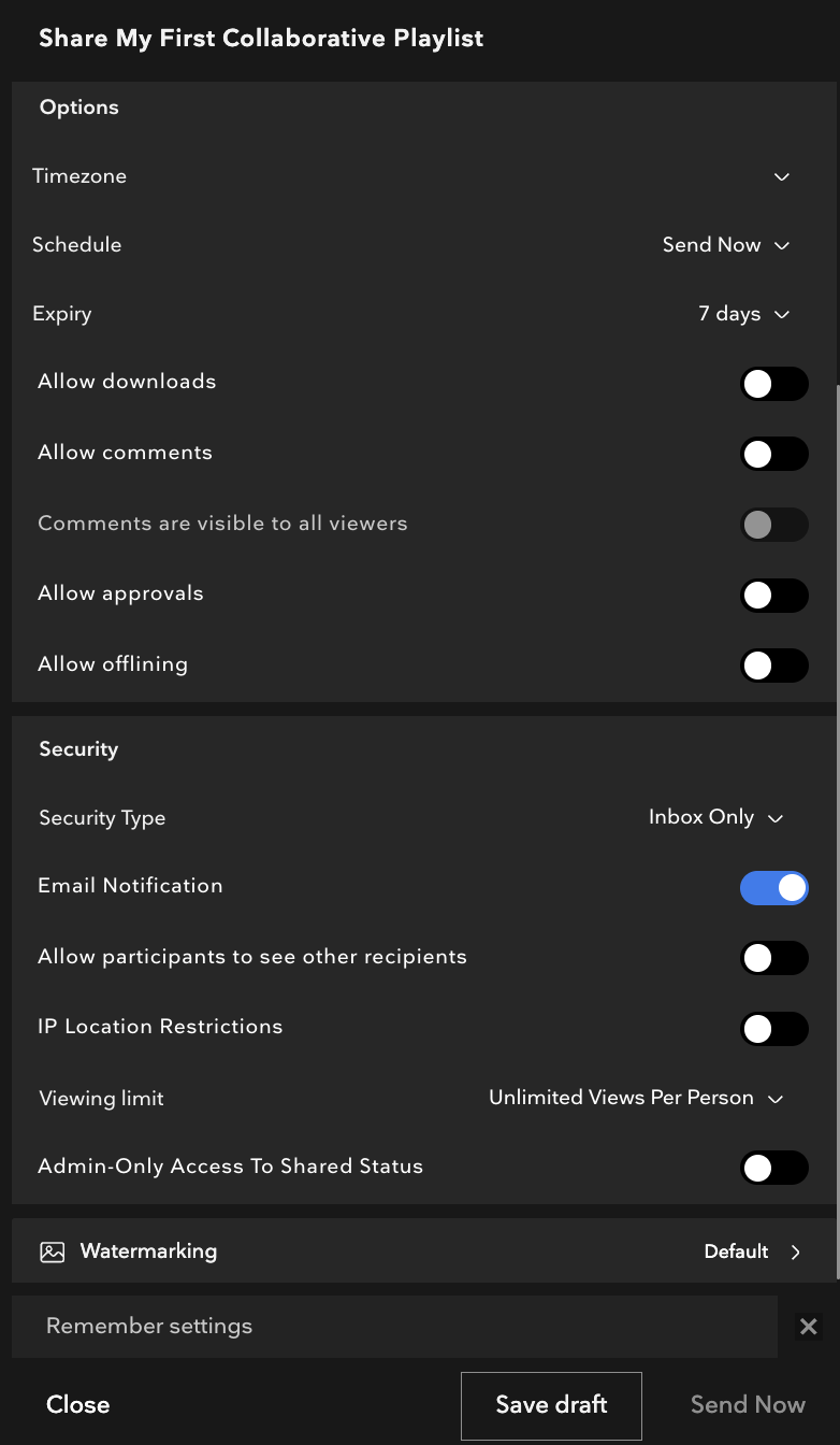 The Watermarking settings allow us to define a specific watermark for this specific Share. This watermark will override the watermark defined at the Folder level, meaning we can make it more intense (or more relaxed) depending on the audience for this specific Share.