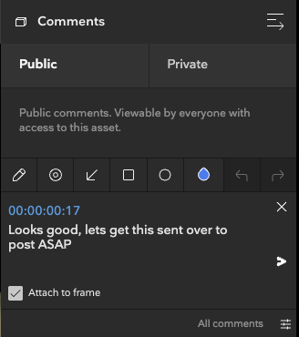 When putting together a new comment you now have the ability to toggle if the comment should be attached to the timestamp of the current frame (frame-level commenting) or the asset generally (asset-level commenting)