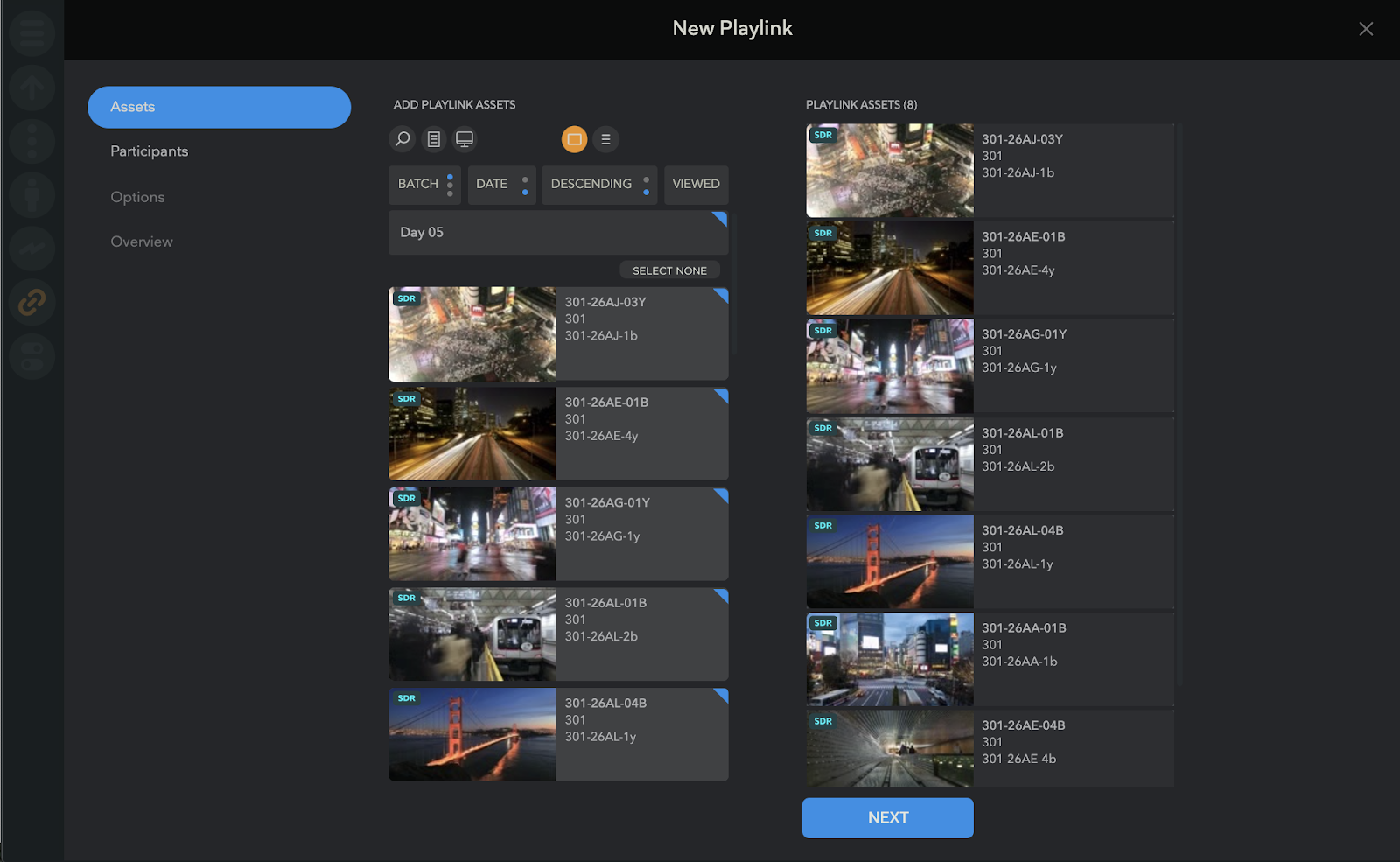 First you'll populate the playlink with assets. Select the batch you'd like to choose the assets from and click each one to select it. You can also Shift+click to select several, click and drag from one column to the other, or use the Select All button to get everything from a batch in one go.