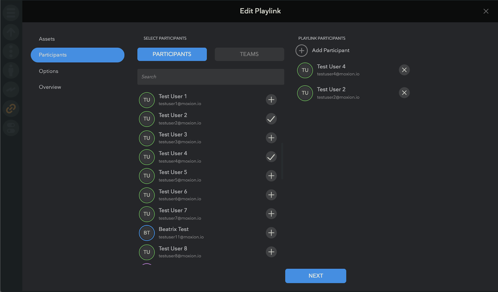This step lets you choose who you'll be distributing your playlink to. Clicking the + next to the contact's name will add them to the Playlink Participants column.